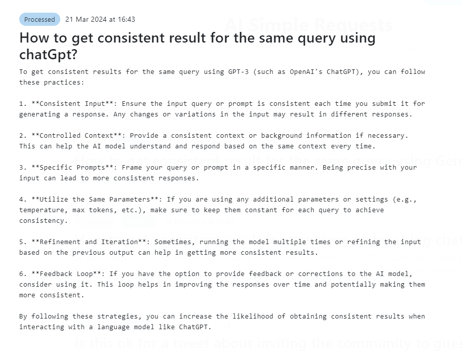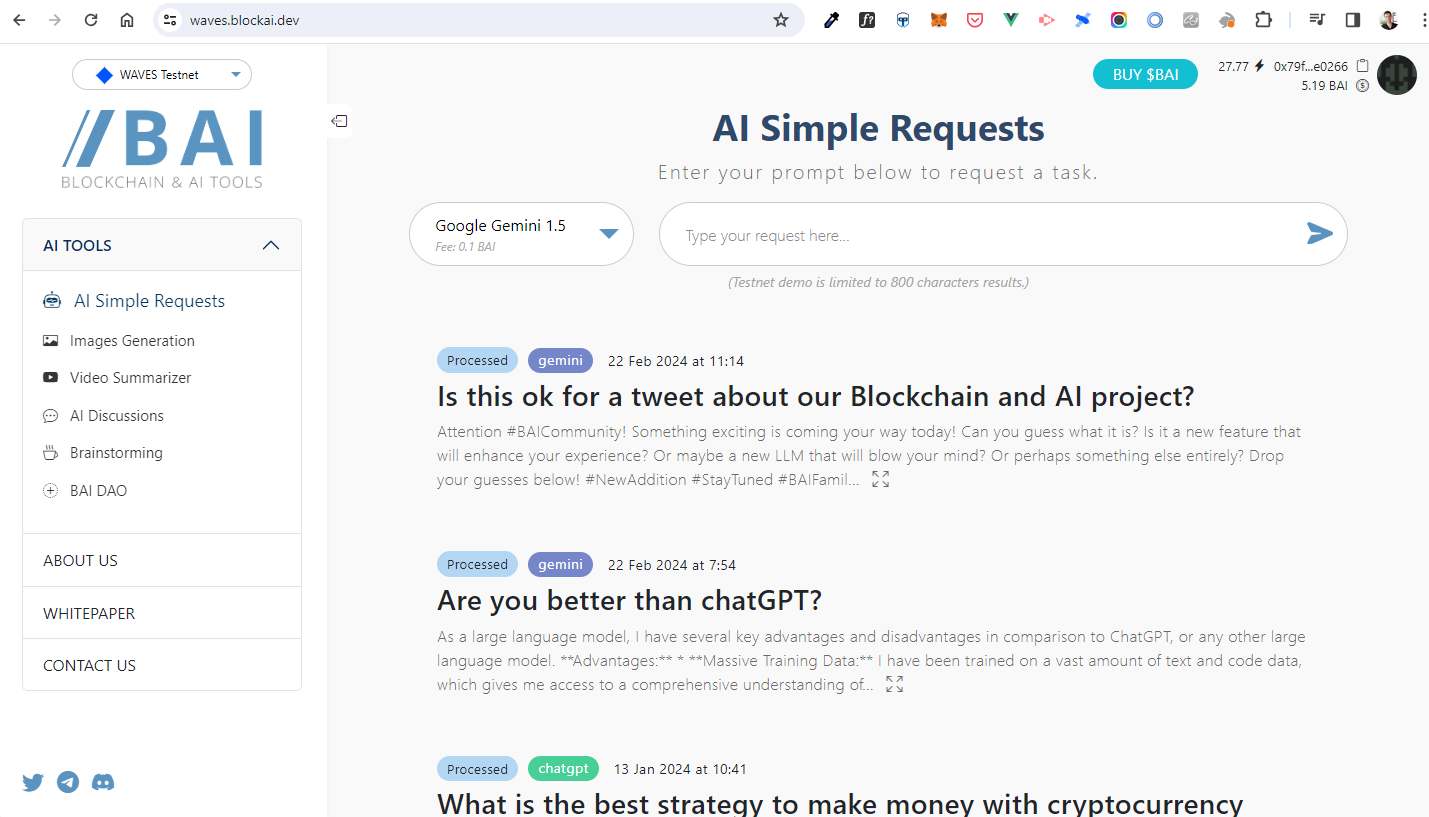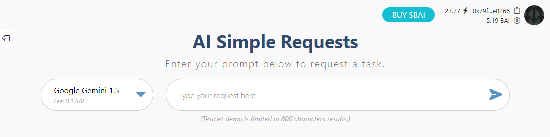 This feature allow you to send text request to the selected AI and receive the result to your connected account. This can be used from our web UI or from a smart contract using a callback.
