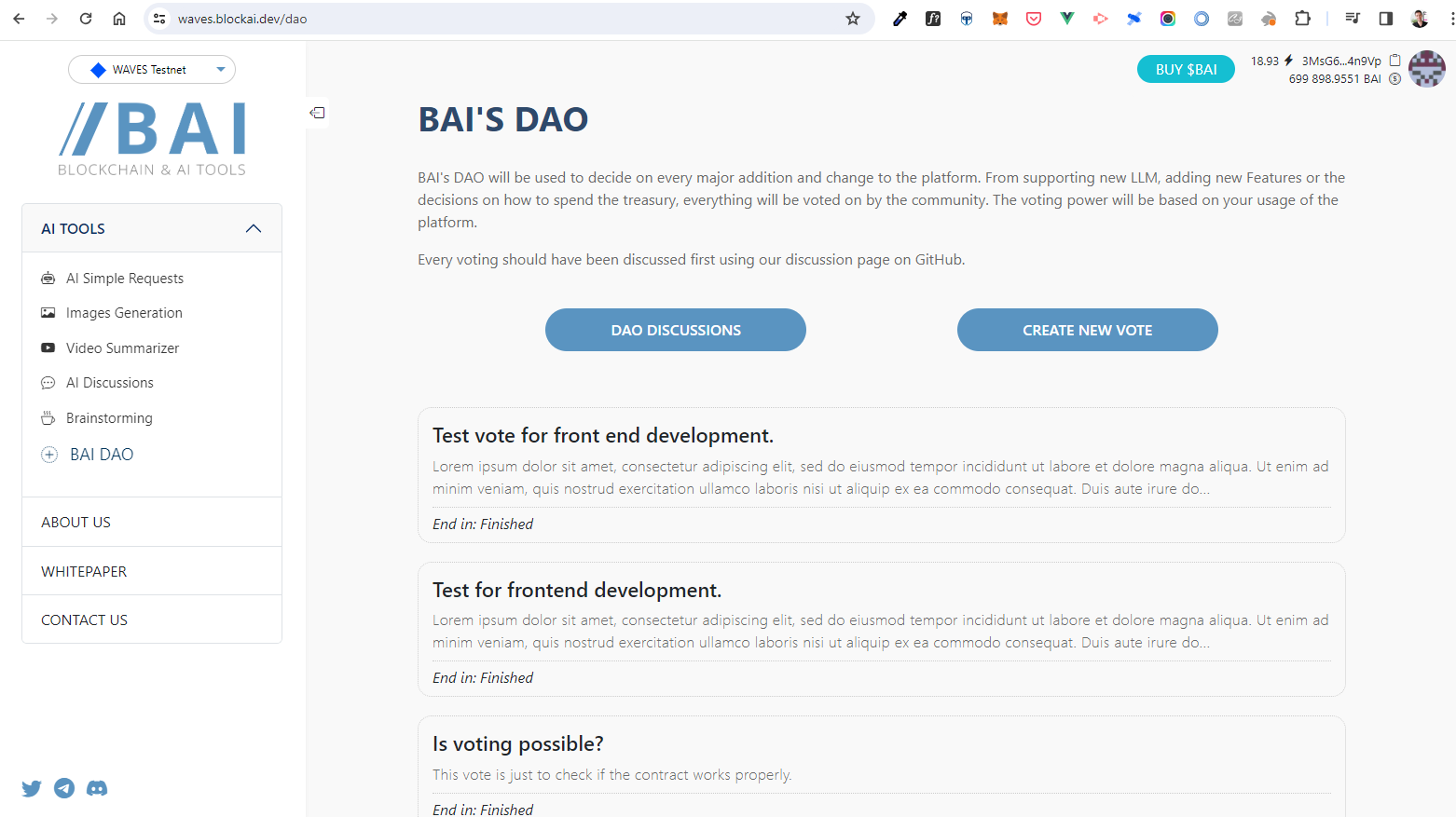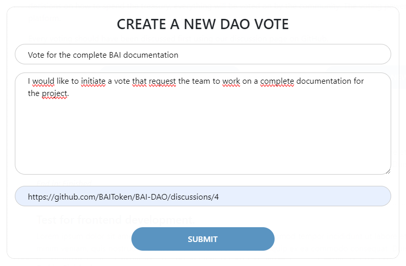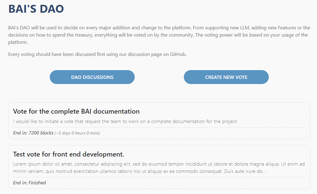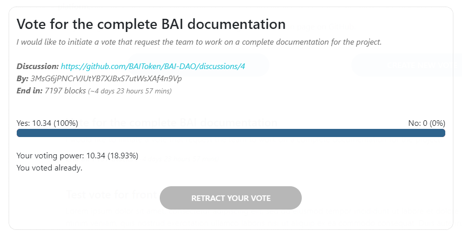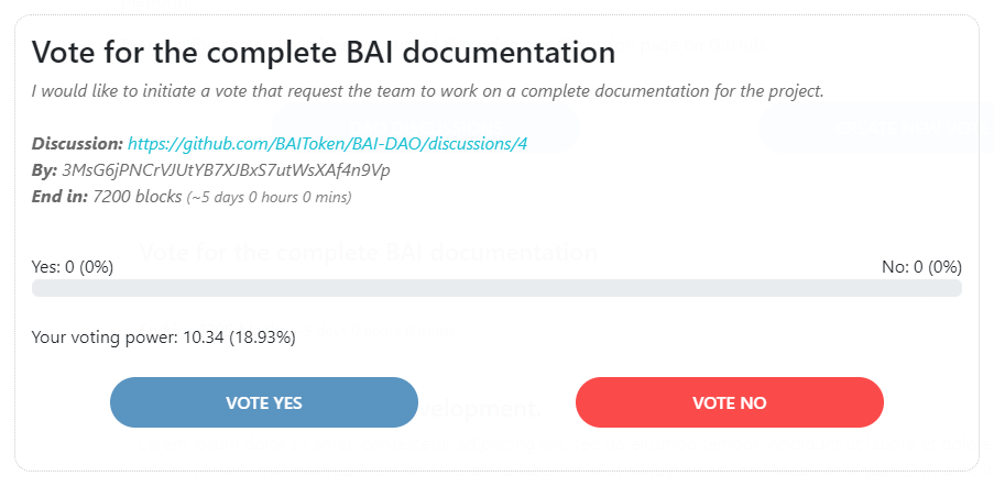 Keep in might that you will need to have used the platform to a certain treshold to be able to start a new vote, currently this treshold is very low, at 1 $BAI and will be updated later through a community vote.